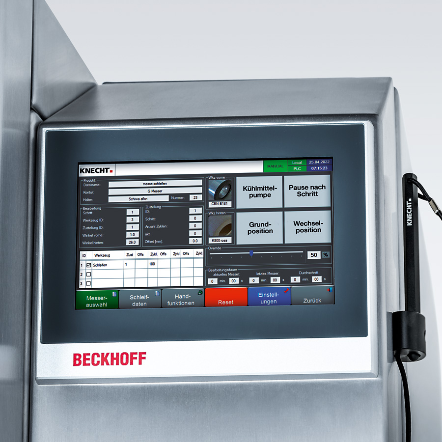 The cutting tools are clamped on universal knife holding fixtures. The grinding feed and the precise rolling of the slicer knives on the grinding wheels are performed by servo drives. This technology ensures nearly wear-free operation of the A 75.