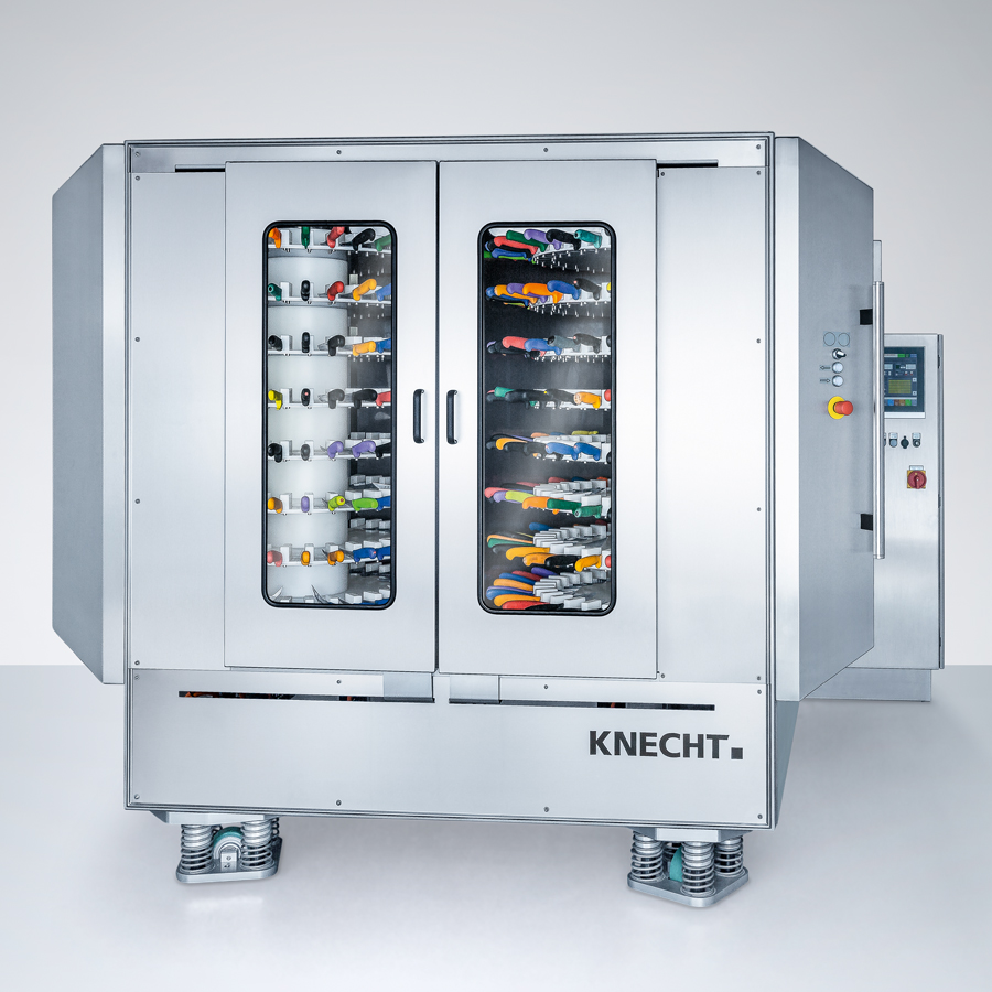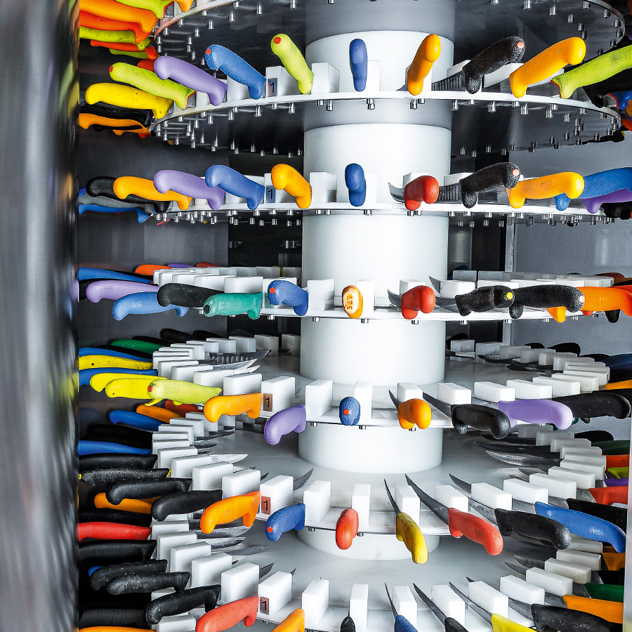The E 50 RT sharpens hand knives of various shapes and sizes fully automatically. The output is up to 780 hand knives per 8 hour shift at 1-2 hours personnel deployment.
