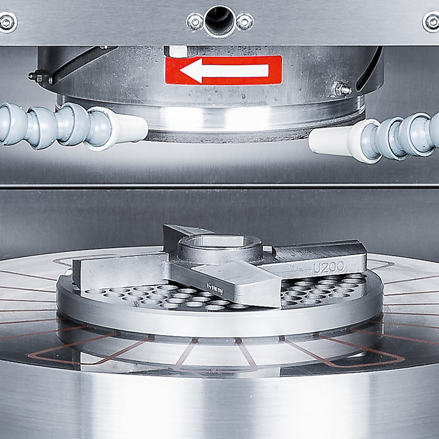 The strong drive motor and the rotary table are installed in a heavy double-T-beam construction. This provides a high degree of material removal. Thus, even very worn workpieces can obtain an exact surface again in a short amount of time.